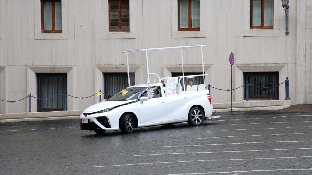 Це один з двох особливих автомобілів, які побудували до візиту Папи Римського до Японії в листопаді 2019 року. Спеціальна Toyota Mirai (тепер уже минулого покоління) пофарбована в традиційний для папамобіль білосніжний колір. Дах над заднім диваном зрізана, натомість встановлено високий навіс, що дозволяє понтифіку спілкуватися з паствою стоячи, тримаючись за поручень. Та й взагалі кузов за центральними стійками серйозно перероблений: машина перевищує п’ять метрів в довжину і 2,7 – у висоту.