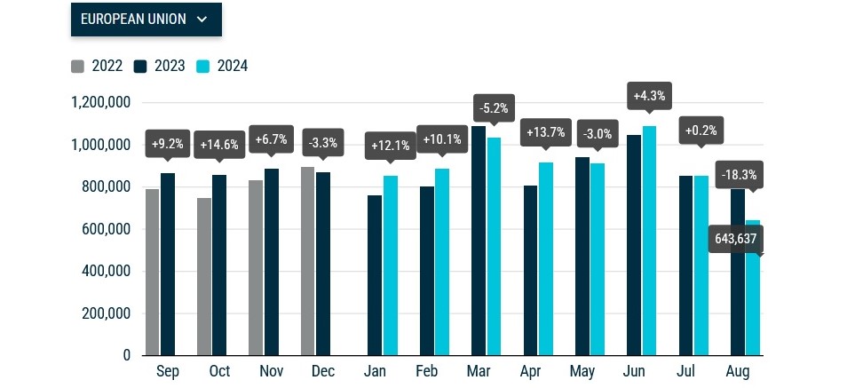 За даними Європейської асоціації автовиробників (АСЕА), у минулому місяці на ринках ЄС було реалізовано 643,6 тис. нових легковиків, що на 18% менше, ніж у серпні 2023 року, повідомляє Укравтопром.