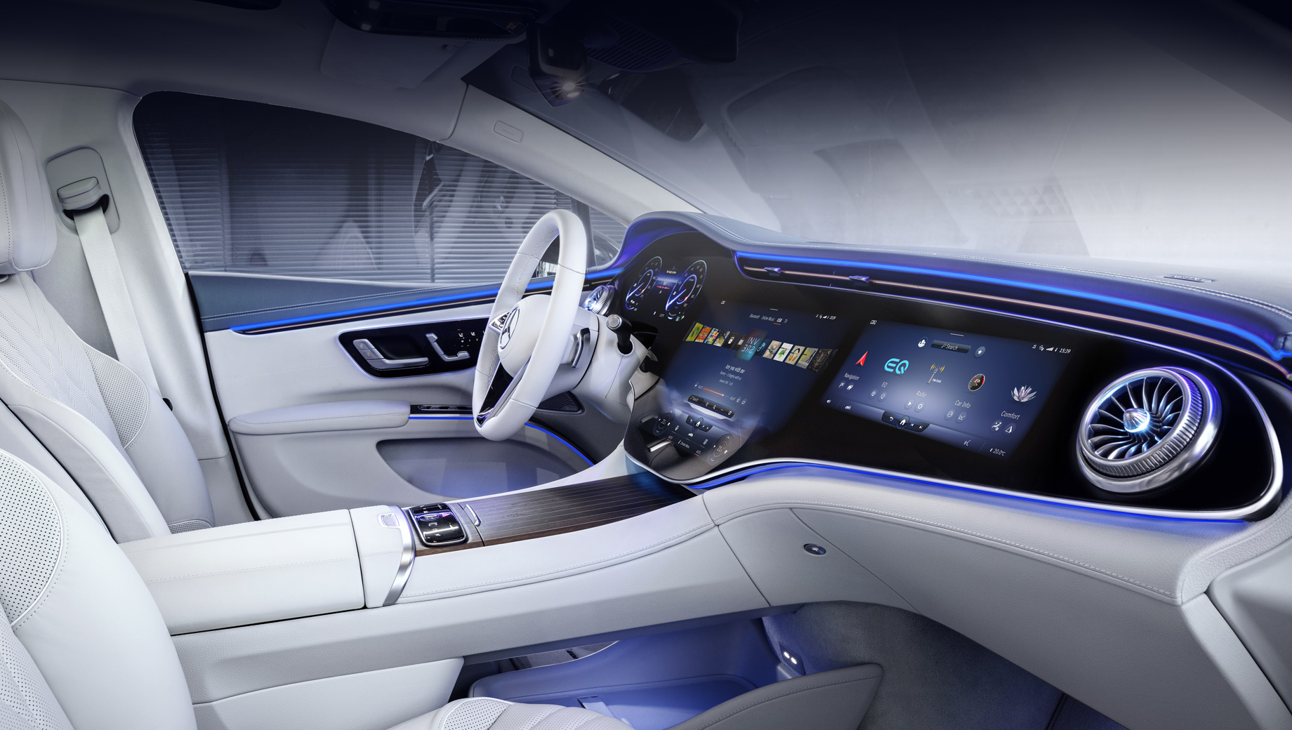 За атмосферу в усіх сенсах відповідальні 710-ватна аудіосистема Burmester з 15 динаміками, система Energizing Air Control Plus (опція) з HEPA-фільтром і спеціально розроблений для моделі аромат No.6 MOOD Linen, названий на честь першого електрокара бренду, моделі Mercedes Electrique 1906 року.